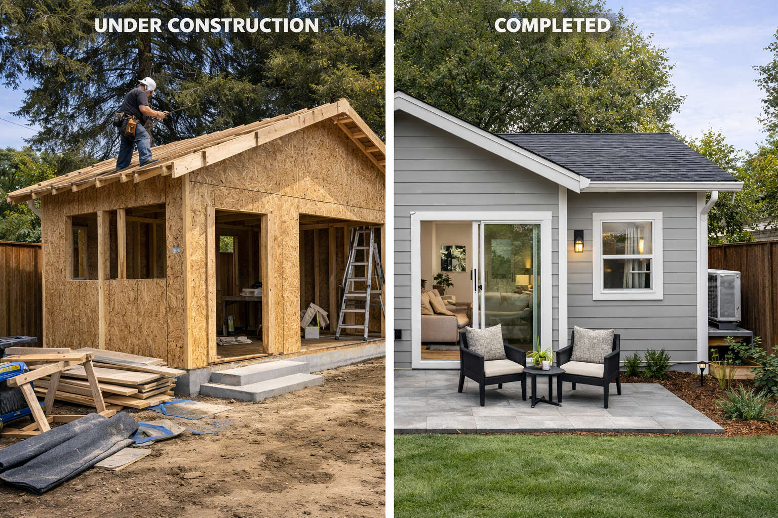 We construct ADUs with efficiency, durability, and code compliance at the forefront. Whether detached, attached, above-garage, or a garage conversion, we manage everything from site prep and utility hookups to framing, mechanical systems, and interior finishes. You’ll have full transparency on permitting, timelines, materials, and construction decisions as we build a functional, high-quality living space tailored to your needs.
